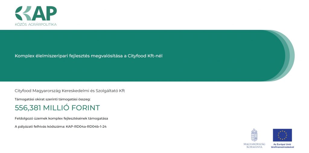 A projekt címe, azonosító száma: Komplex élelmiszeripari fejlesztés megvalósítása a Cityfood Kft-nél, 1008454119